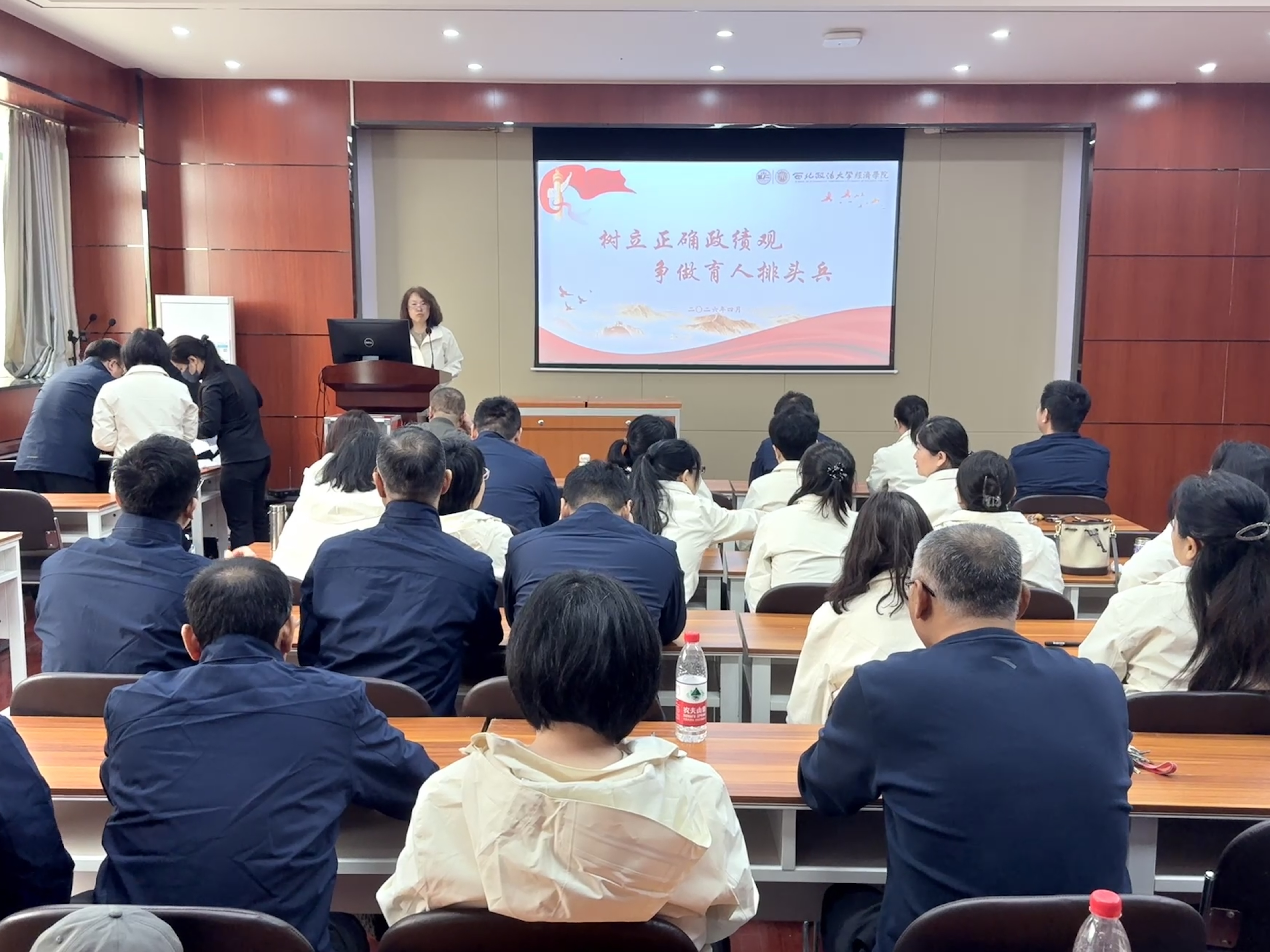 为深入推进师德师风建设,引导全院教职工树立和践行正确政绩观,4月22日上午,学院党委书记李建梅以“树立正确政绩观 争做育人排头兵”为主题,在长安校区天平楼B100教室学院全体教职工讲授专题微党课思政课