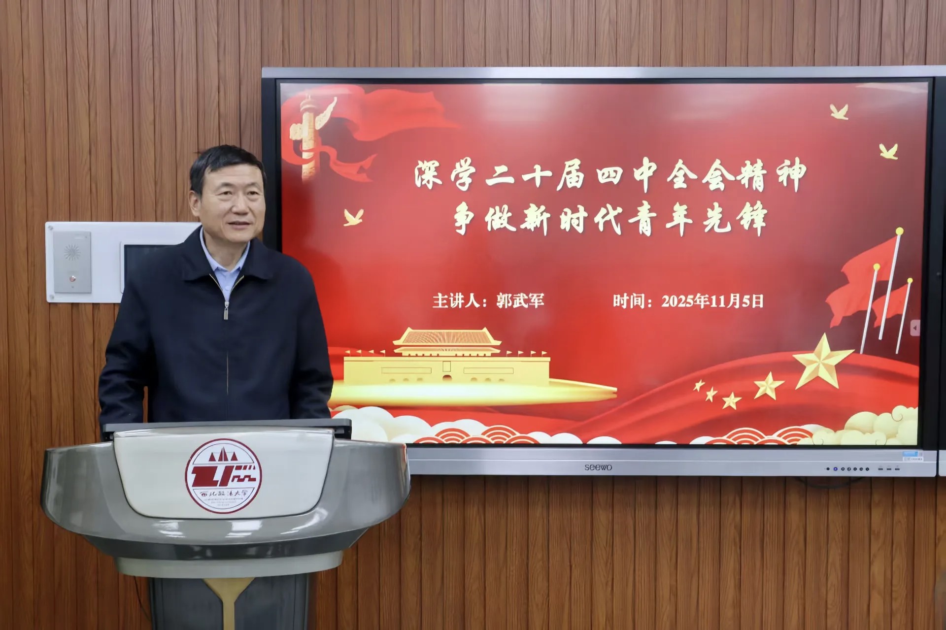 为深入学习贯彻党的二十届四中全会精神,教育引导新生筑牢思想根基、找准青春坐标,11月5日下午,校党委副书记郭武军以“深入学习贯彻党的二十届四中全会精神,争做新时代先锋青年”为题,为bat365在线平台官方网站2025级新生讲授专题思政课。会议由bat365在线平台官方网站党委副书记、副院长侯颖怡主持。