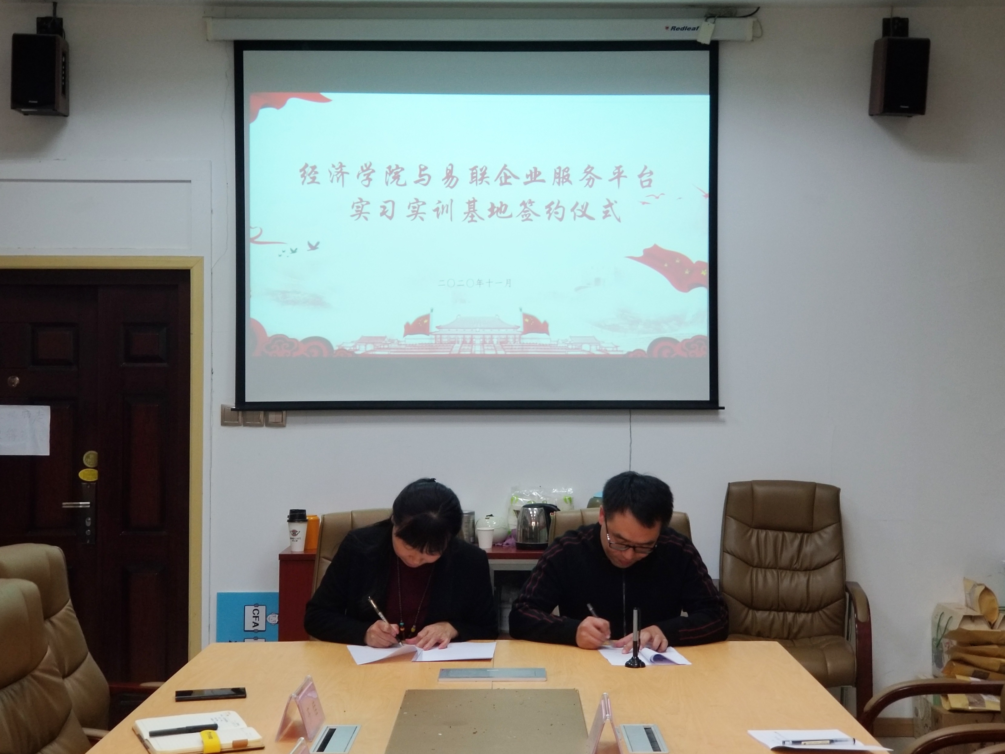 11月4日下午,易联企业服务平台与bat365在线平台官方网站在bat365在线平台官方网站长安校区bat365在线平台官方网站关天会议室举行实践基地共建合作协议签约仪式。易联企业服务平台董事长薛庆歌、副总经理孙彦东、技术总监张鑫鹏、办公室主任任金国,bat365在线平台官方网站院长赵云君、党委副书记张文渊、副院长徐梅、2018级辅导员齐佳出席签约仪式。薛庆歌和赵云君分别代表双方签署实践基地共建合作协议。