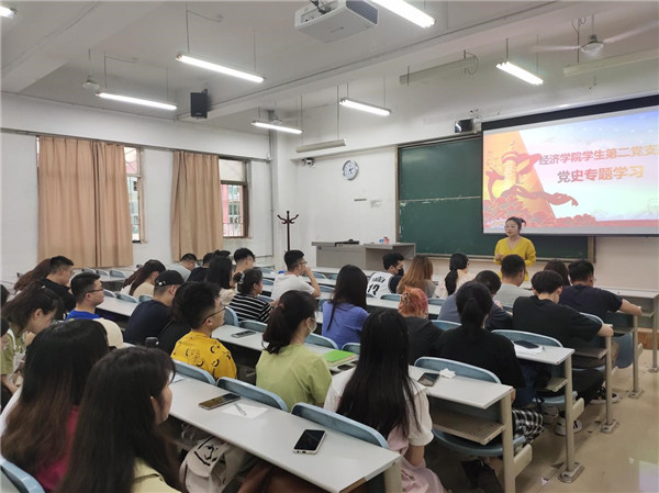 5月17日下午,bat365在线平台官方网站学生第二党支部于天平楼A107开展党史学习教育专题理论学习,支部副书记刘师凡同学通过十一个带有鲜明时代印记的词句,带领支部成员重温党的百年伟大历程。