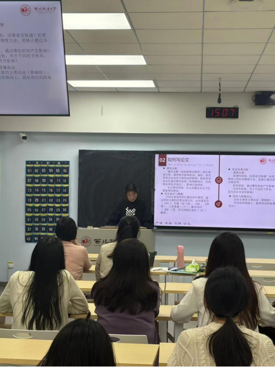 随后,周涛则结合从硕士到博士阶段的论文写作经历,提出论文写作可从模仿创新起步。他将实证类文章划分为三类并结合具体案例,清晰讲解模仿创新的方法与写作流程,帮助同学们直观理解论文写作思路。他强调毕业论文的核心要求在于工作量充足、规范性强。最后,在互动交流环节,周涛博士结合自身论文阅读与写作的实践经验,针对现场同学们提出的问题逐一进行详细解答。