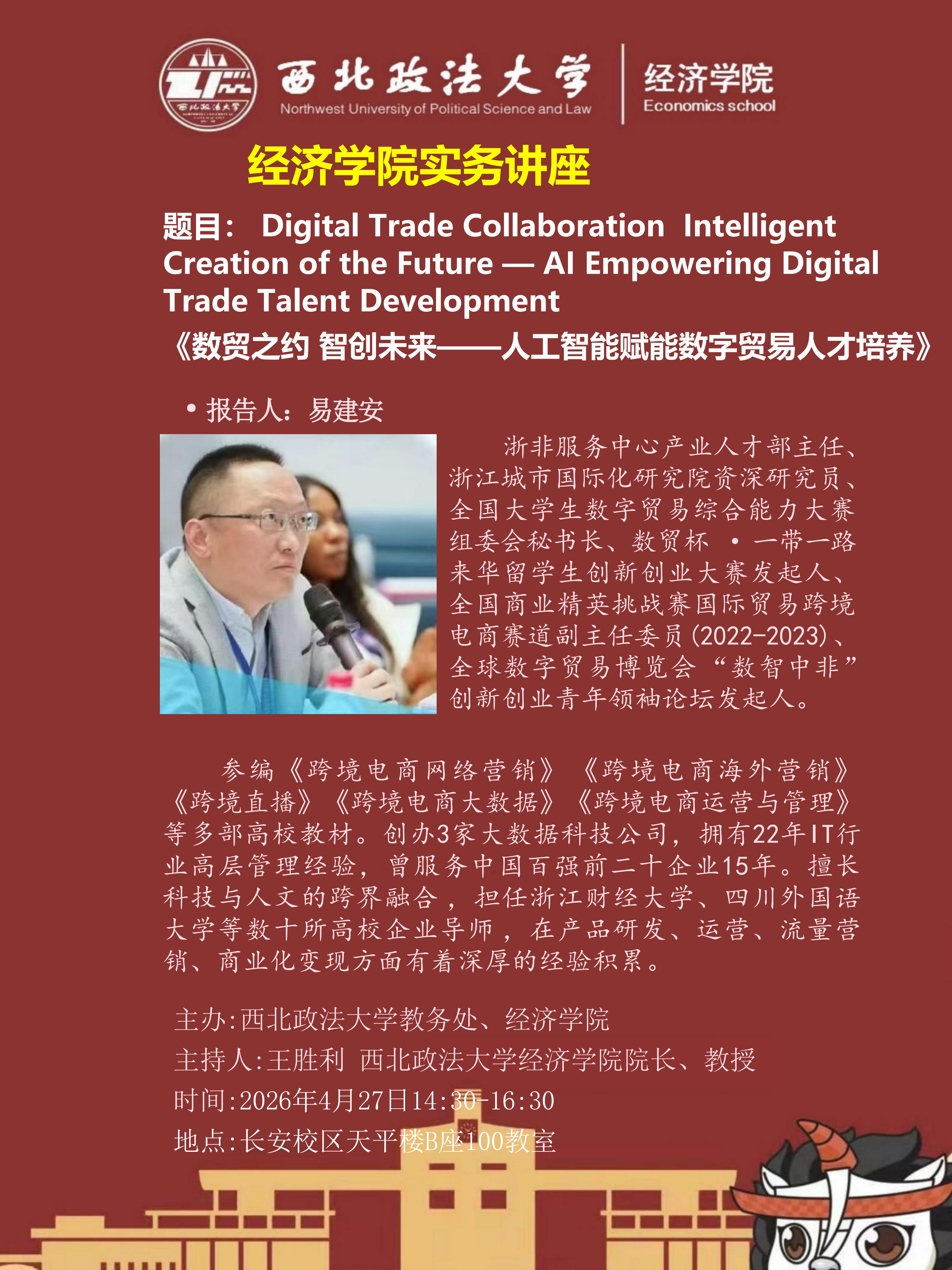 为顺应国际贸易数字化转型发展趋势,聚焦人工智能赋能人才培养模式创新,bat365在线平台官方网站特邀全国大学生数字贸易综合能力大赛组委会秘书长易建安来校举办专题讲座,为学生创造更多了解数字贸易领域前沿理论与实践的交流机会,现将具体安排通知如下: