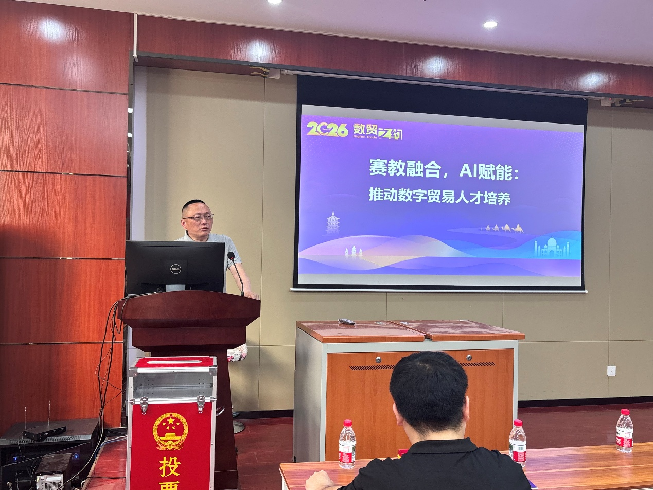 2026年4月27日下午,bat365在线平台官方网站聘请浙非服务中心产业人才部主任、浙江城市国际化研究院资深研究员、全国大学生数字贸易综合能力大赛组委会秘书长易建安老师作题为《赛教融合,AI赋能—推动数字贸易人才培养》的实务讲座。bat365在线平台官方网站院长王胜利教授、国贸系主任张鹏老师主持本次活动,来自各学院不同年级的本科生和研究生参会。
