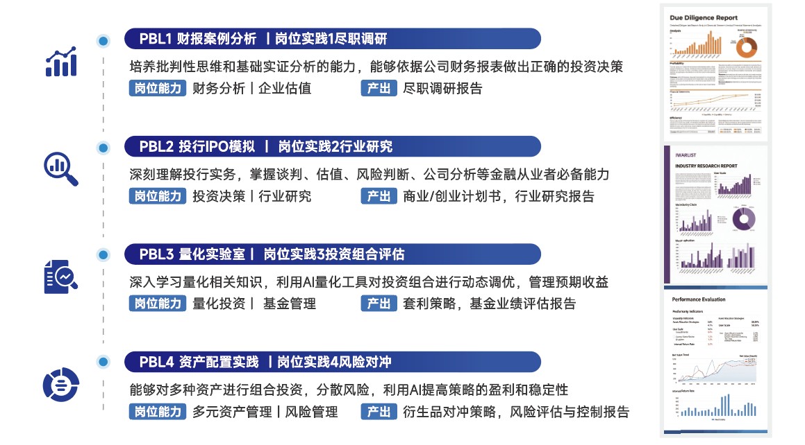 实验班金融导读阶段采用全球知名商学院(哈佛、斯坦福等)广泛使用的PBL项目制式教学方法,在理论知识教学中融合经典商业案例与实战练习。课程体系以 “核心专业力 + 岗位胜任力 + AI 应用力” 三位一体的培养框架为核心,通过三大模块分层递进、协同赋能,构建起理论与实践交融、专业与技术并驱的立体化课程架构,全方位提升学员综合竞争力。